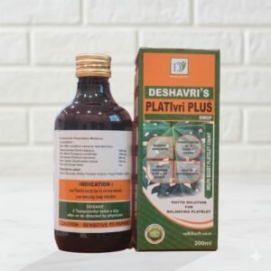 Deshavri Plativri Plus is a unique Ayurvedic formulation designed to support the body’s natural defense mechanisms, especially during viral infections like dengue. This powerful syrup helps to boost immunity and increase platelet count, which can be compromised during such illnesses. Formulated with a blend of four researched herbs—Papaya, Giloy, Tulsi, and Neem—it offers a natural way to aid recovery and restore vitality. Packed in a convenient syrup bottle, it provides a holistic approach to wellness.